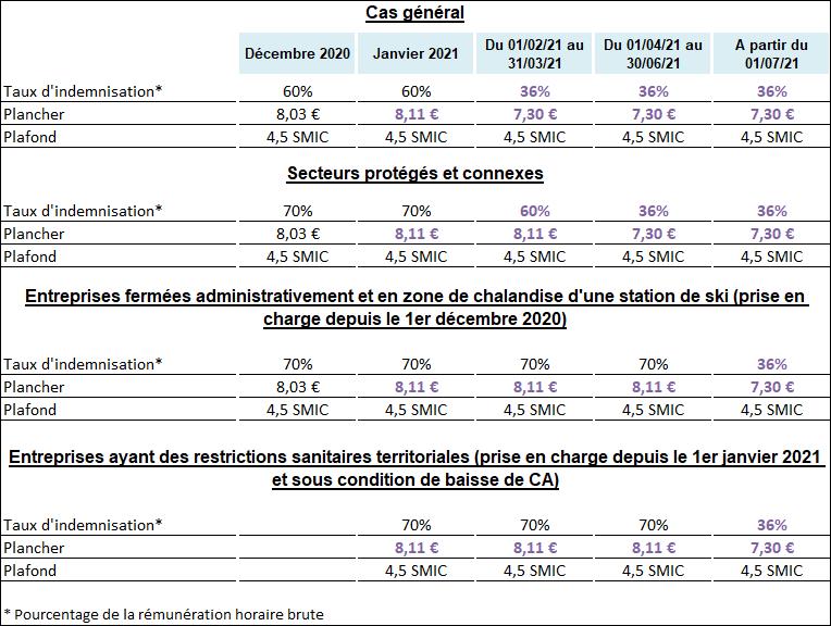 Les règles d’indemnisation sont modifiées à compter du 1er février 2021. Les personnes concernées percevront une indemnité égale à 70 % de la rémunération horaire de référence, limitée à 4,5 SMIC, avec un plancher de 7,30 €. Le taux horaire minimum ne s’applique pas aux salariés en contrat d’apprentissage et à ceux en contrat de professionnalisation. L’employeur recevra une allocation égale à 60 % de la rémunération horaire de référence, limitée à 4,5 SMIC.
