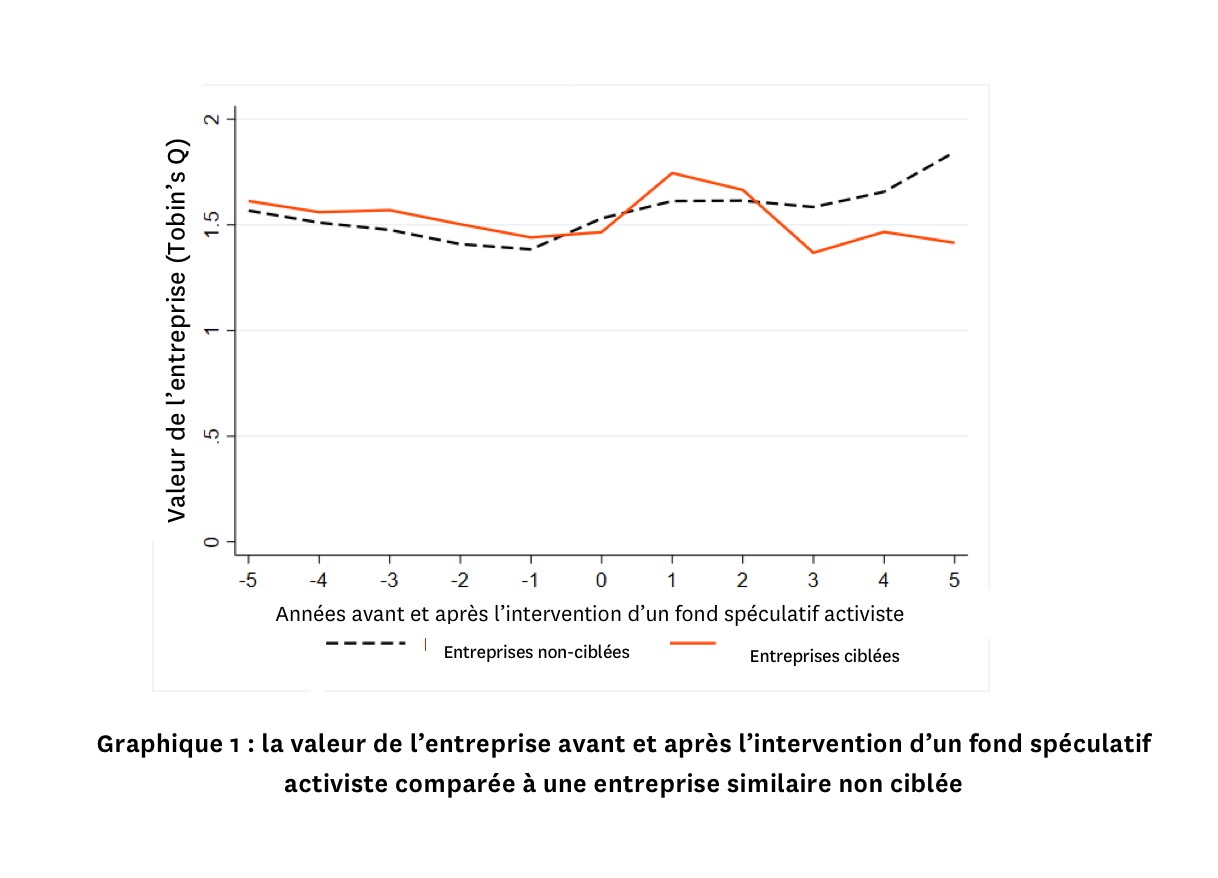 Pourtant, une étude du Harvard Business Review menée sur 1324 entreprises américaines ciblées par les fonds activistes offre un constat sans appel. A court terme, l’intervention d’un fonds tendrait effectivement à accroître la valeur de la société. Néanmoins, à plus long terme, l’impact sur la valeur est négatif et les sociétés ciblées semblent performer moins bien que les sociétés non ciblées.