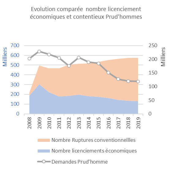 A l’observation, il s’avère que la baisse du nombre de licenciements économiques est antérieure aux lois Macron. En effet, la forte diminution de cette catégorie de licenciements semble dater de 2008, à partir de l’adoption de la législation sur les ruptures conventionnelles. En 2009, à la suite de la crise des « subprimes », le nombre de licenciements économiques atteint un pic à 300 milliers par an.